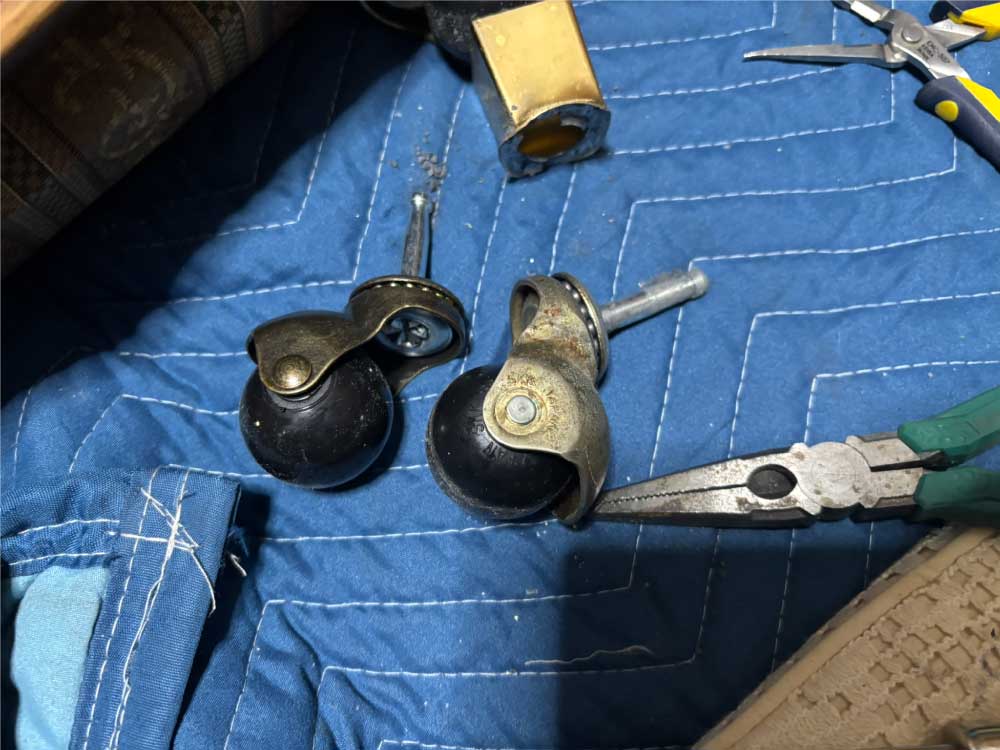 まずは現在のキャスターを外しますが、既に外れている箇所、ぐらぐらで手で簡単に外れる箇所もあれば、これでもかというほどに完全にくっついている箇所もあります。