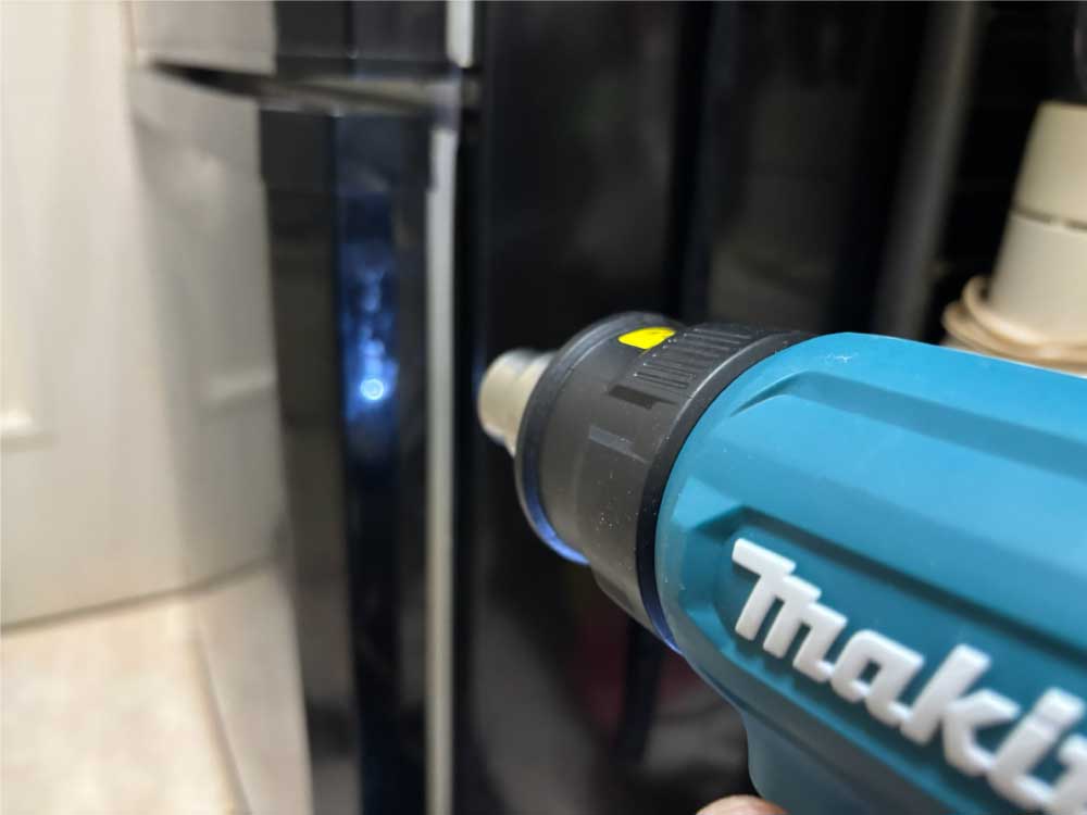 ヒートガンをあててますが、パッキンや冷蔵庫本体を溶かしてしまわないよう、低温でじっくりがポイントですね。